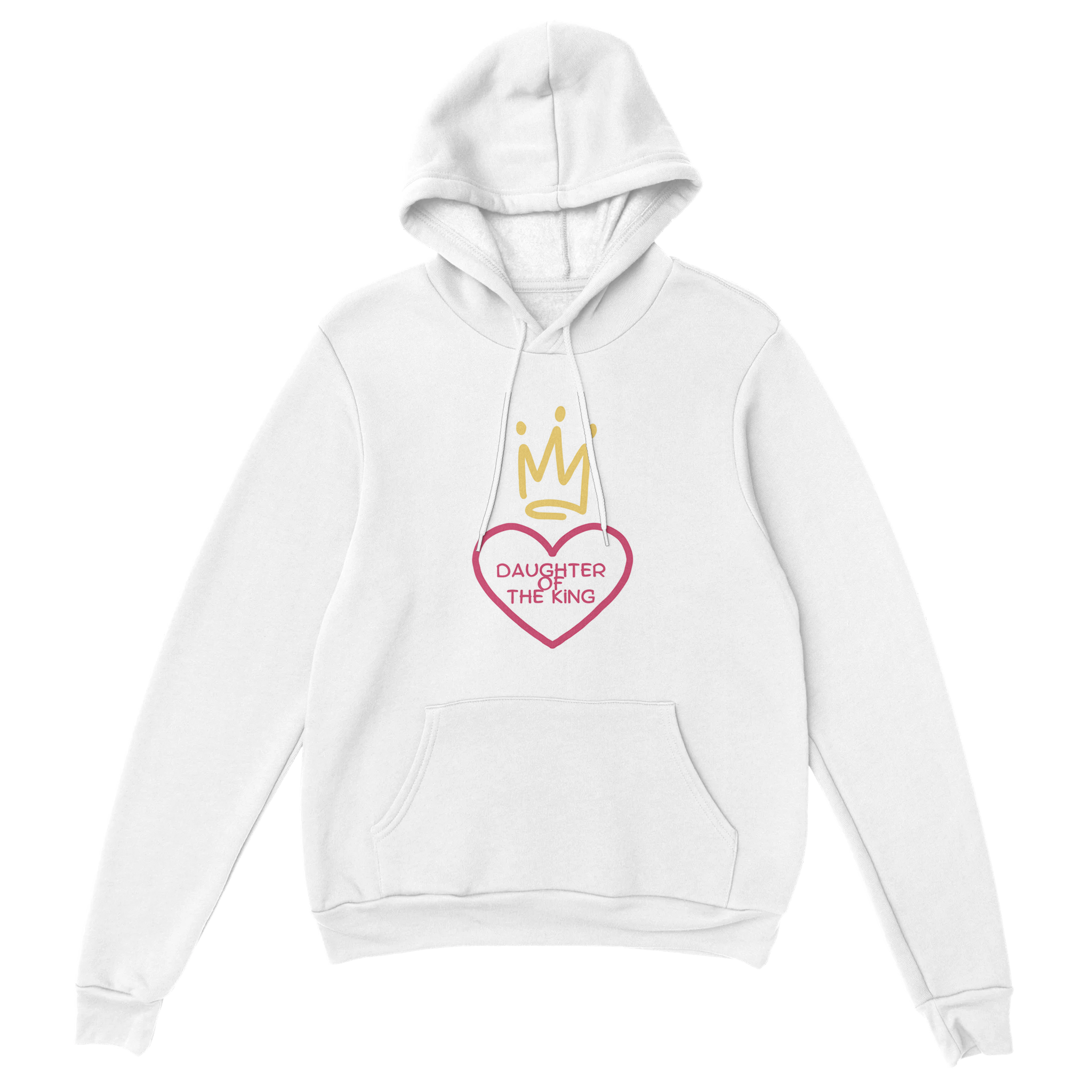 A classic hoodie with a large front pouch pocket and drawstrings in matching color.Preshrunk fleece knitAir jet yarn gives softer feel and reduced pillingDouble-lined hood with color-matched drawcordTear away labelDouble-needle stitching at shoulder, armhole, neck, waistband and cuffsPouch pocket1 x 1 rib with spandexQuarter-turned to eliminate centre creaseFibre content varies by color, see color list for exceptionsThis product is made on demand. No minimums.•Daughter of the King Book Christi Given www.ChristiGiven.com•Size guide SMLXL2XL3XL4XL5XLA) Length (cm)68.671.173.776.278.781.38486B) Half Chest (cm)50.855.9616671.176.28186C) Sleeve Length (cm)85.187.690.292.795.397.8100103 SMLXL2XL3XL4XL5XLA) Length (inches)27282930313233.133.9B) Half Chest (inches)20222426283031.933.9C) Sleeve Length (inches)33.534.535.536.537.538.539.440.6•Care instructionsWashMachine wash warm (max 40C or 105F), wash garment inside out with similar colorsTumble DryLowBleachOnly non-chlorineDry CleanDo not dry cleanIronDo not iron