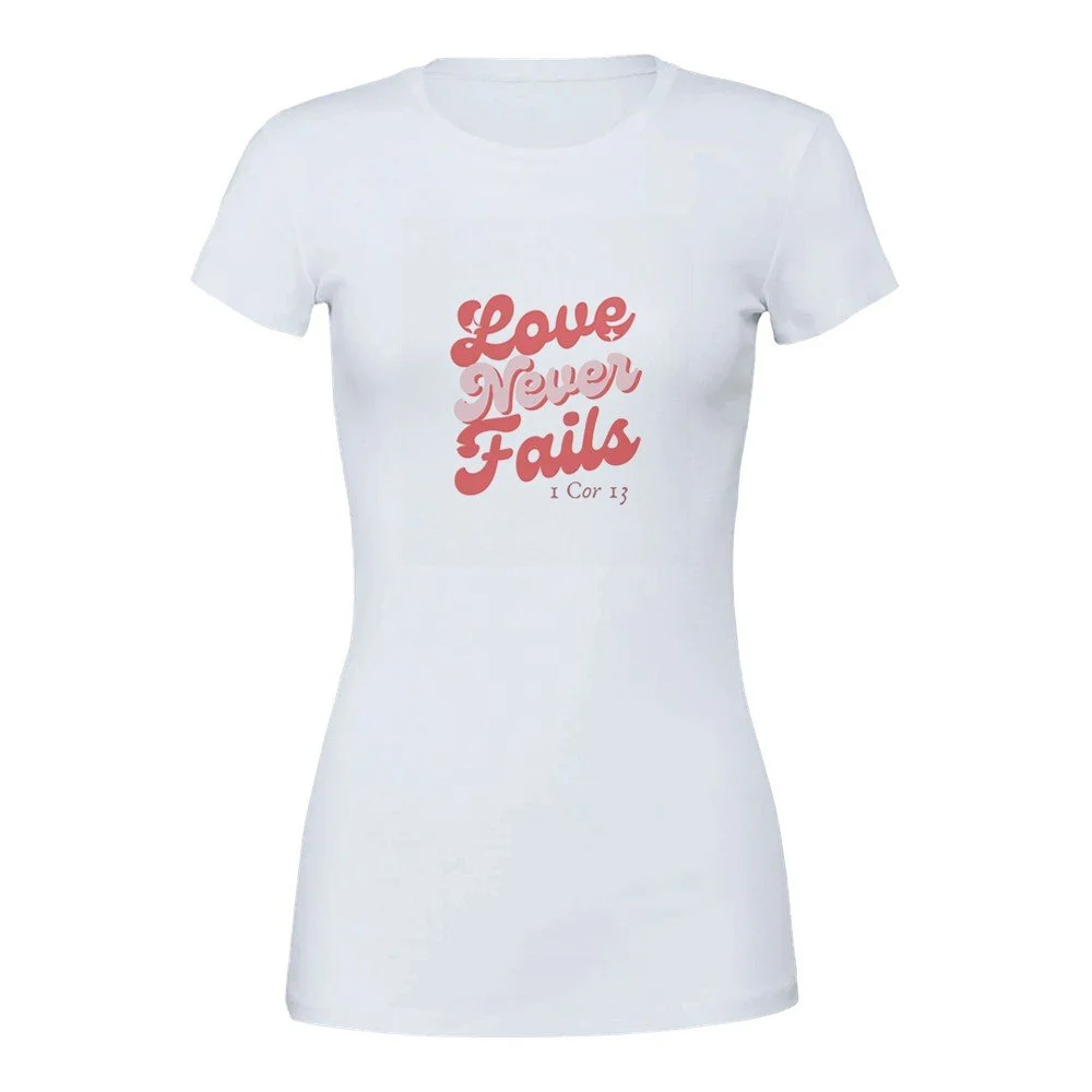 Love Never Fails— Premium Womens Crewneck T-shirt | Bella + Canvas 6004 White